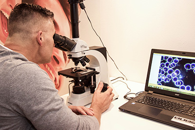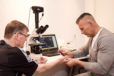 Via een vingerprik wordt er een bloeddruppel afgenomen en meteen onder de microscoop geanalyseerd.